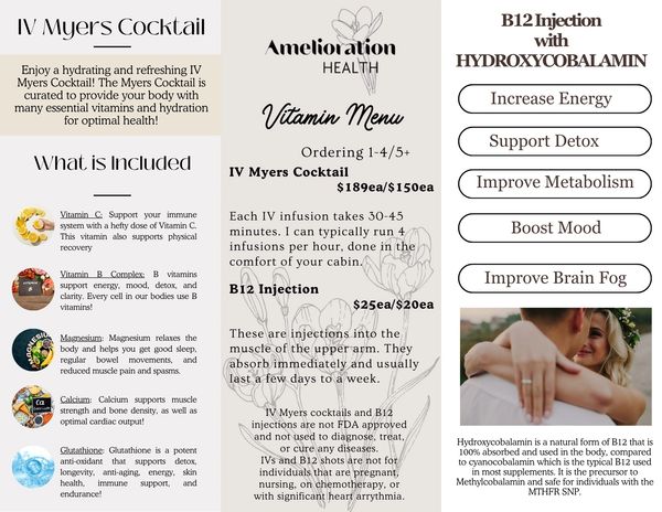 Relax in the comfort of your cabin at Three Peaks Ranch at receive a vitamin packed and hydrating Meyers Cocktail IV Therapy. Ashley can book up to 20 IVs per party. So everyone in your wedding party can receive an IV! Ashley also offers B-12 shots!