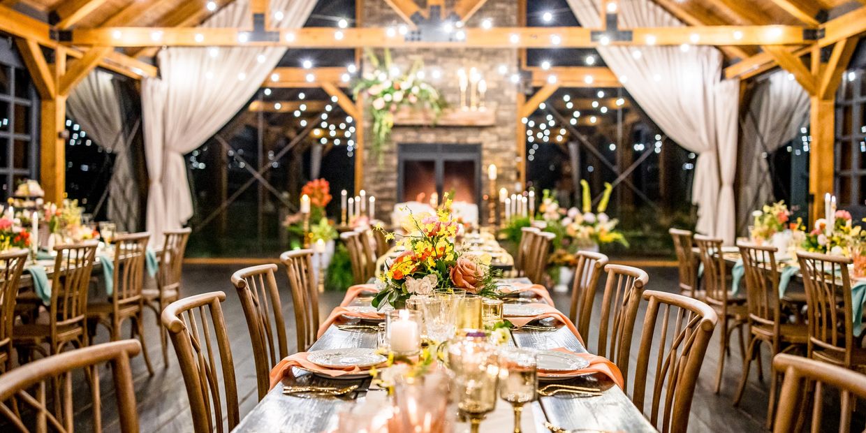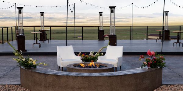 Our spacious Glass Pavilion provides the ideal venue for your reception. This versatile space boasts floor-to-ceiling windows showcasing the majestic peaks, while the large attached deck and patio offer additional event space under the stars. String lights and a fire pit create a warm and inviting ambiance.