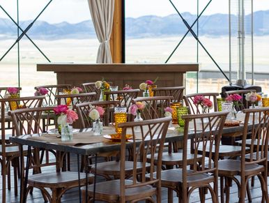 Imagine exchanging vows amidst a breathtaking backdrop of massive mountains and fields dotted with wildflowers. Our dedicated ceremony site features a beautiful boardwalk leading up from the Glass Pavilion, creating a truly magical atmosphere for your special moment.